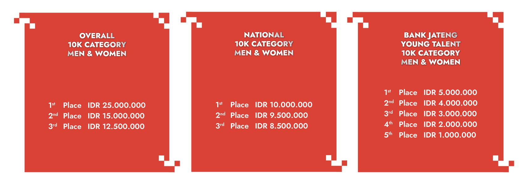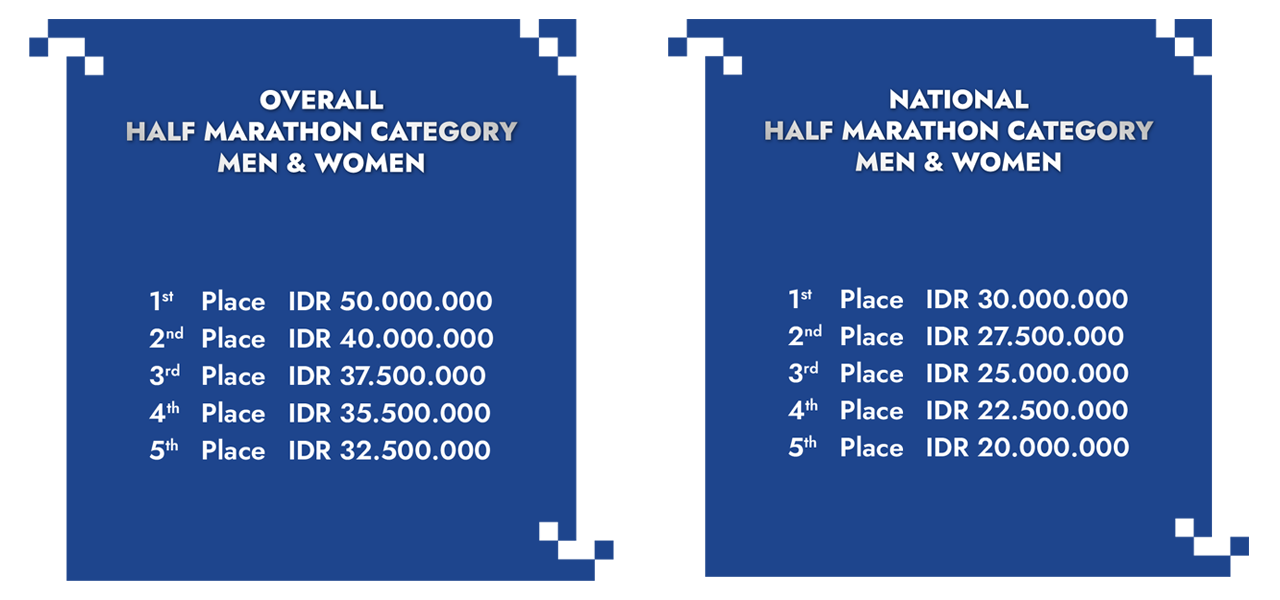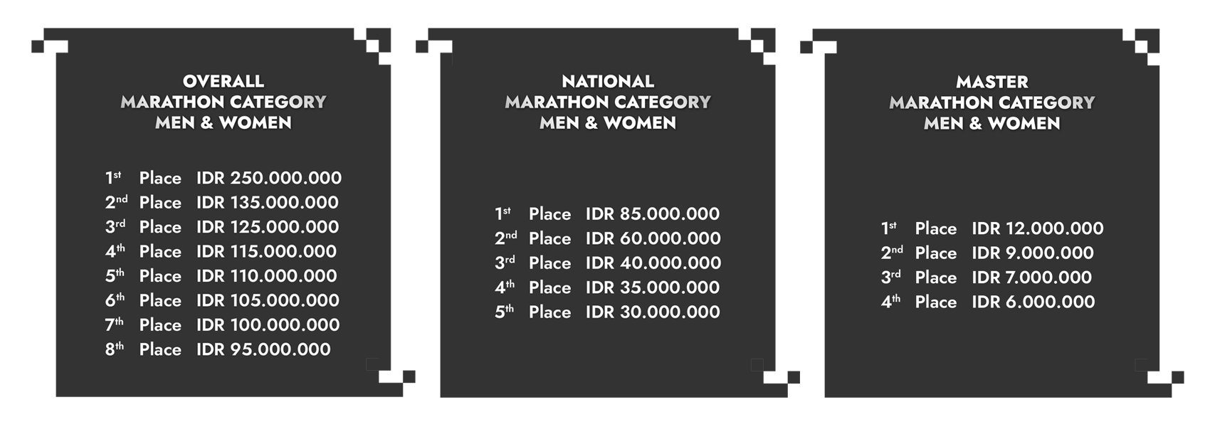 Winners who are Indonesian citizens who are 40 (forty) years old or older on Race Day, have the opportunity to win Overall Podiums, National Podiums or Marathon Indonesian Masters (whichever amount is higher). The winner can only take one prize from one of the podiums they won (without double dipping)